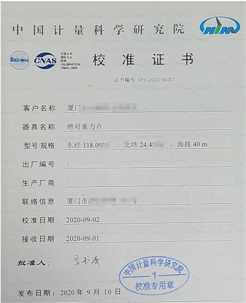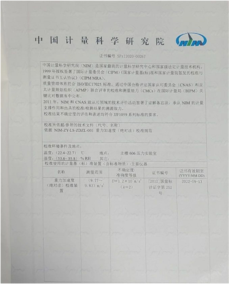 我們以創(chuàng)威公司廈門某客戶為例。2020年,廈門某技術(shù)機(jī)構(gòu)購買了創(chuàng)威公司3臺(tái)0.005級(jí)的活塞式壓力計(jì),其中有1臺(tái)氣體真空活塞式壓力計(jì)、2臺(tái)全自動(dòng)活塞式壓力計(jì),量程區(qū)間為-0.1~60MPa。同時(shí)全權(quán)委托創(chuàng)威公司對其實(shí)驗(yàn)室進(jìn)行重力加速度的實(shí)地測量,并出具國家機(jī)構(gòu)的測試校準(zhǔn)證書。