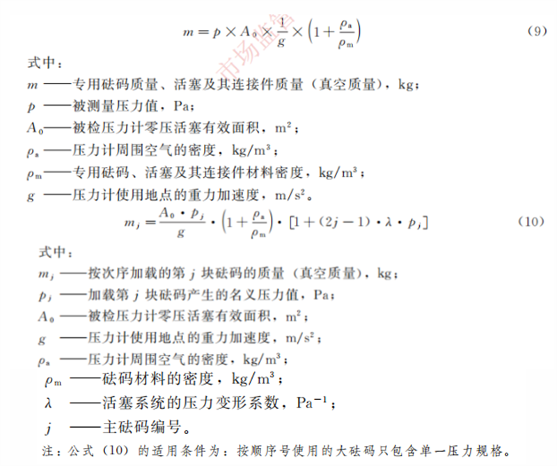 調(diào)整的內(nèi)容:測量范圍上限為25MPa及以上的壓力計,若配套的專用砝碼是標稱壓力值的,則按順序號使用的大砝碼質(zhì)量按公式(10)計算,活塞及其連接零件和不按順序使用的砝碼質(zhì)量按公式(9)計算。