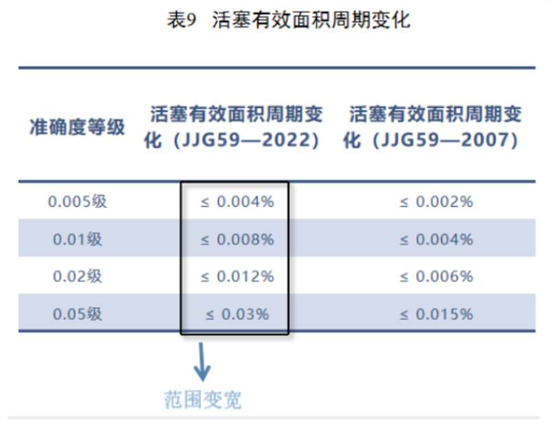 2007版規(guī)程規(guī)定的0.01級專用砝碼質(zhì)量最大允許誤差為±0.003%,新規(guī)程變更為±0.002%。(2022版中對活塞及其連接件質(zhì)量作了和專用砝碼質(zhì)量最大允許誤差同樣的規(guī)定,2007版中只有專用砝碼質(zhì)量要求。