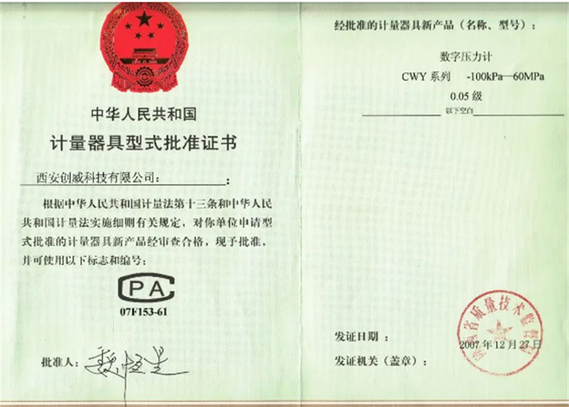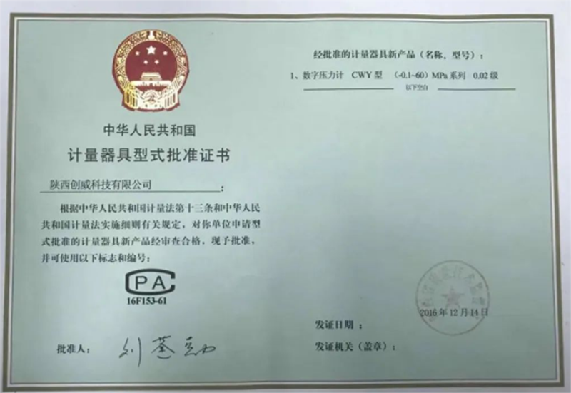 創(chuàng)威公司對(duì)數(shù)字壓力計(jì)的研發(fā)與升級(jí),馳而不息。從2007年取得《中華人民共和國計(jì)量器具型式批準(zhǔn)證書》后,就開始生產(chǎn)0.05級(jí)的數(shù)字壓力計(jì),2013年取得0.02級(jí)數(shù)字壓力計(jì)型式批準(zhǔn)證書,2021年開始生產(chǎn)0.01級(jí)數(shù)字壓力計(jì)。