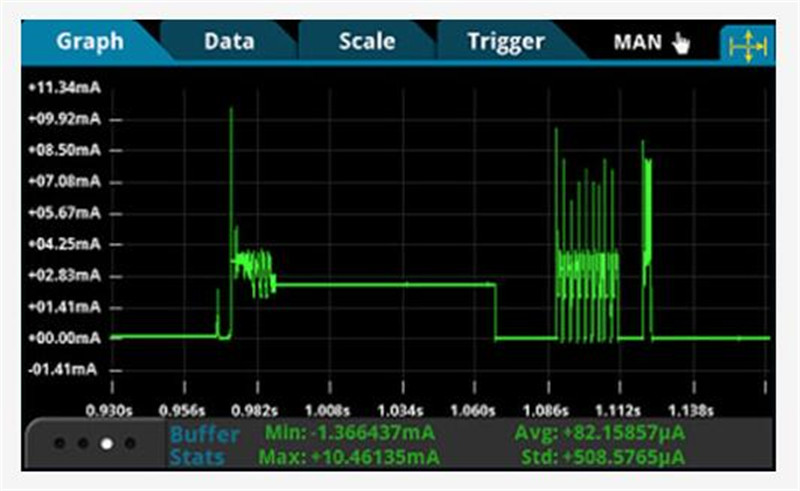 DMM7510 的數(shù)字化器可以測量 IoT 設(shè)備操作狀態(tài)下的漏電流。結(jié)合利用高分辨率、高速數(shù)字化器的靈敏快速電流測量,捕獲 μA 睡眠模式電流和高達(dá) 1A 的傳輸電流。